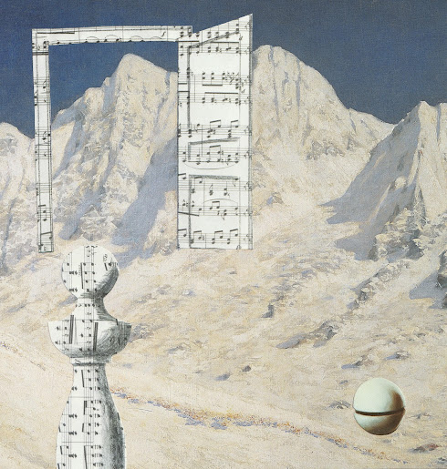 The pieces I took from two Magritte works are "The Knowledge" 1961 featuring the music covered figure and doorway and a grelot from a painting entitled "Memory" 1948.
